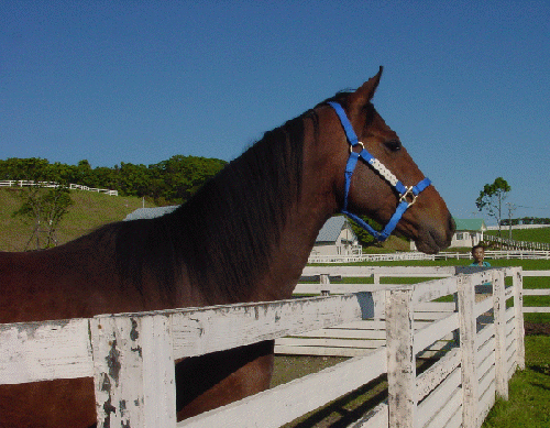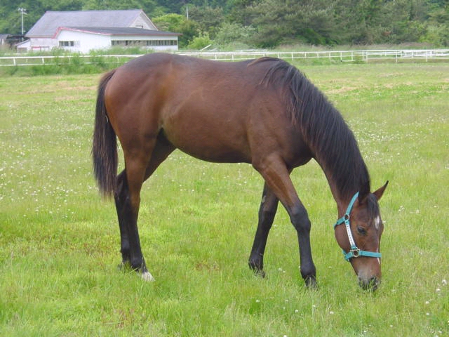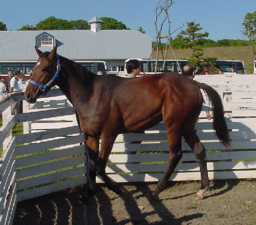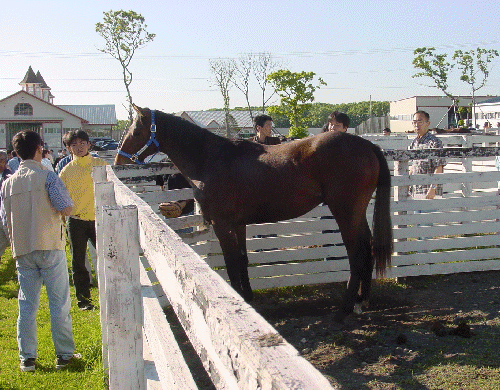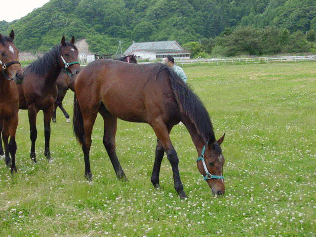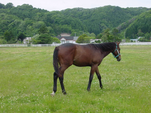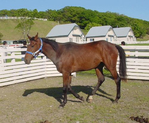 一年ぶりの再会 2001-6-23 逞しく成長しています コスモビューファームで皮膚病治療のため 休養中でした。 ツアーが明けてから運動再開の予定です |